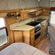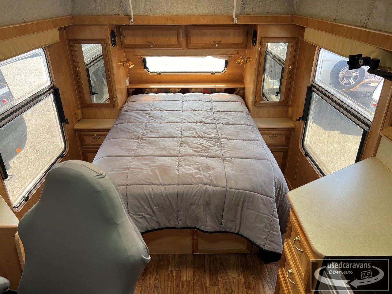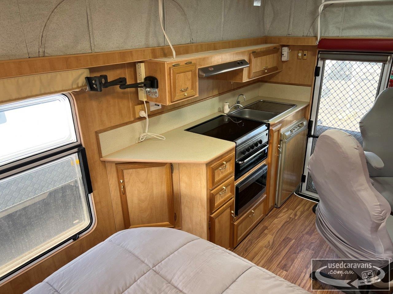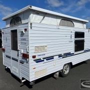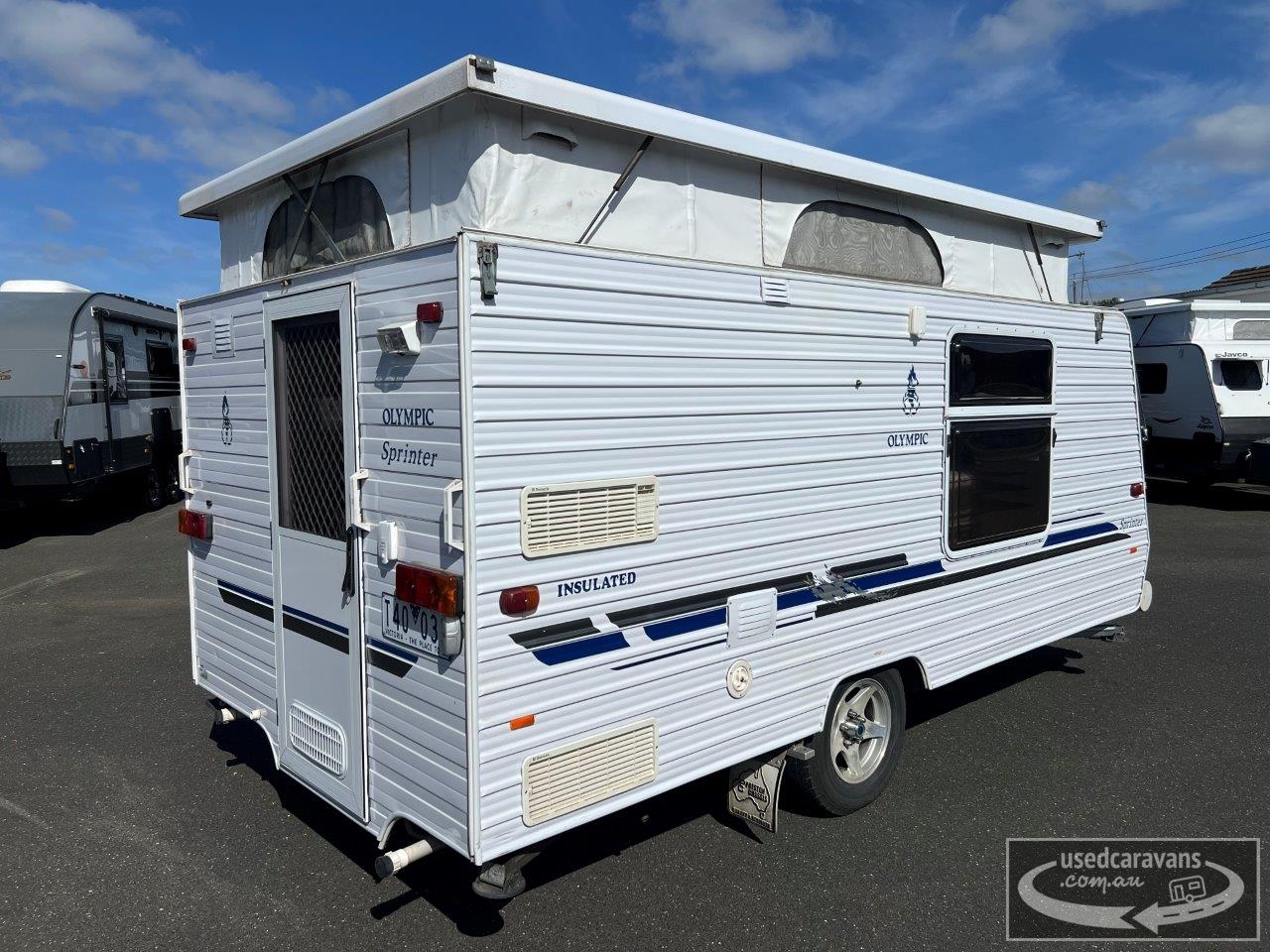 Olympic Sprinter 16' Pop Top, side rollout awning, rear awning, 3 way 90 litre fridge, microwave, single axle, 100ah Gel battery & 1000w inverter, 240v panel heater, double island bed with innerspring mattress & under bed storage, 4 burner gas stove & grill, chequer plate front, pole carrier, front boot, tare 965 kgs, ATM 1265kgs, T40033
