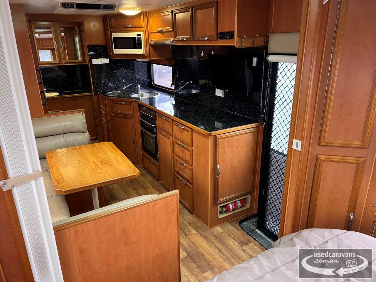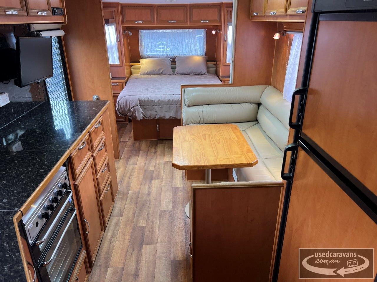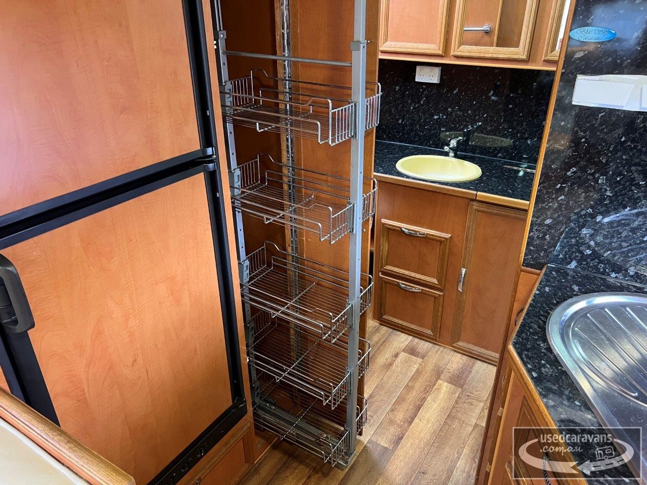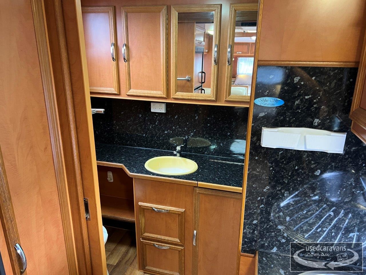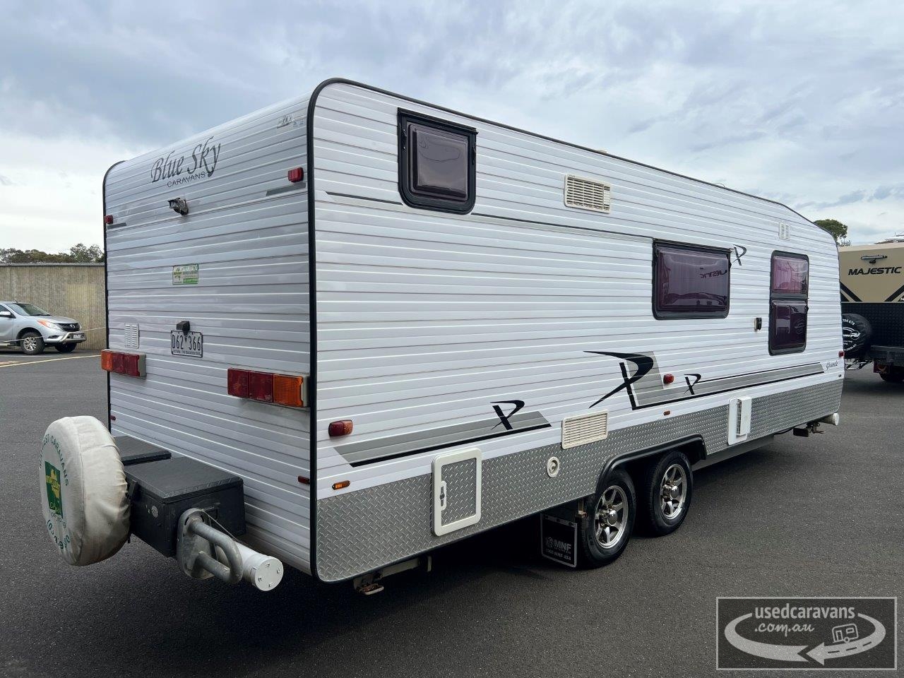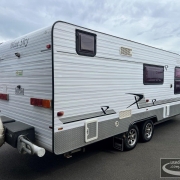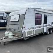 Blue Sky Grande Caravan, full ensuite & washing machine, queen island bed with under bed storage, club lounge, Dometic 2 door 3 way fridge/freezer, microwave, A frame with storage tray, tandem axle, 15” wheels, Dometic air conditioning, gas/electric stove, grill & oven, gas/electric hot water service, large rollout pantry, Winegard antenna, front boot, battery pack & solar panel, roll out awning, slide out BBQ, tare 2094kgs, D62366