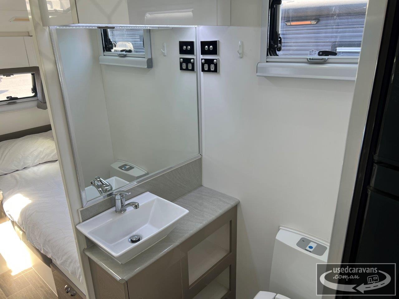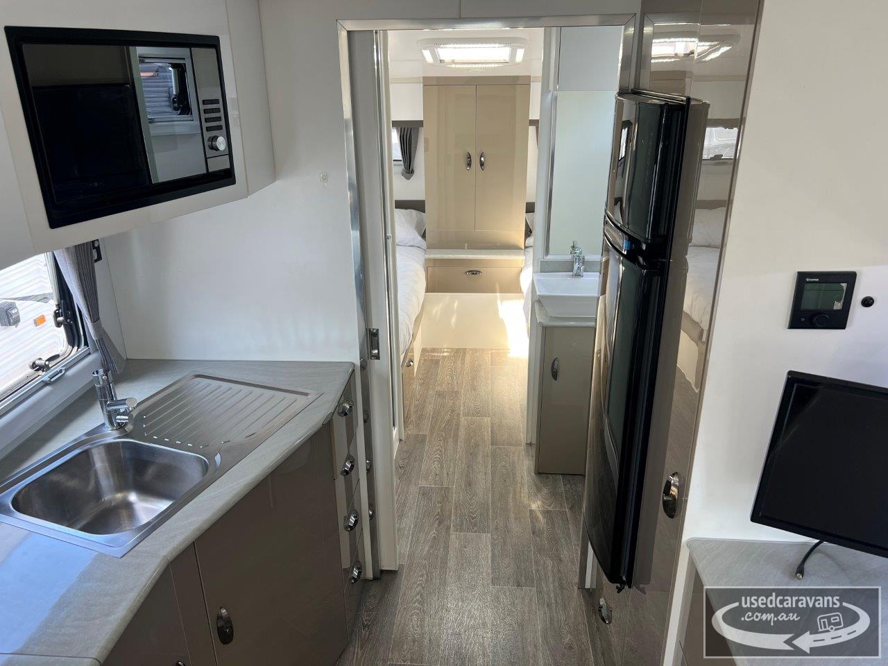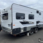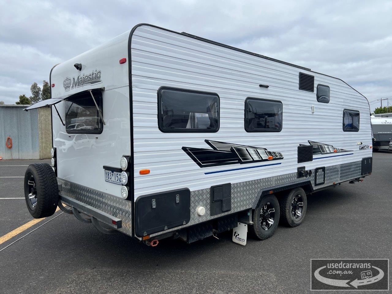 Majestic Knight SLX Caravan, single beds with innerspring mattresses & under bed storage, centre ensuite, rear club lounge, top load washing machine, roll out awning & annexe walls, 2 door Thetford 3 way fridge/freezer, Truma gas heater, microwave, tandem axle with shock absorbers, 235/75R15 wheels & tyres, double glazed windows, Dometic air conditioning, gas/electric stove, grill & oven, triple rollout pantry, Winegard TV antenna, gas/electric hot water service, grey water tank, 2 batteries and 2 solar panels, 2000w inverter, picnic table, 6” A frame with storage tray, front & rear tunnel boots, tare 2496kg, Y83152