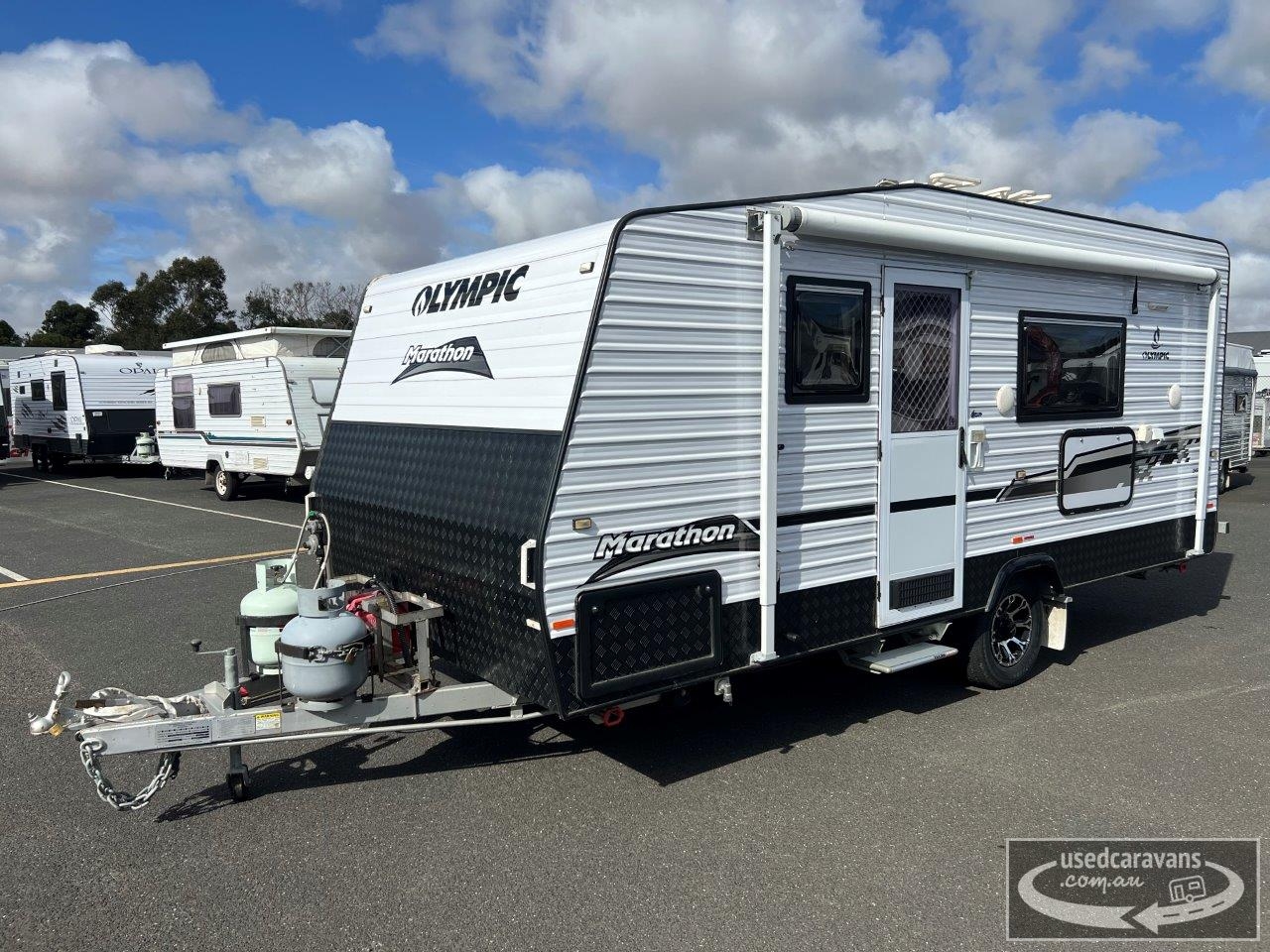 Olympic Marathon 17’6 Caravan, full ensuite, queen island bed with innerspring mattress & under bed storage, battery pack with solar panel, rollout awning, 3 way 150 litre fridge, microwave, single axle, cafe dinette, diesel heater, grey water tank, Gree air conditioning, 12v fan, Winegard antenna, gas/electric stove, grill & oven, chequer plate front & sides, tare 1720kgs, ATM 2150kgs