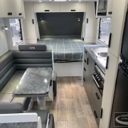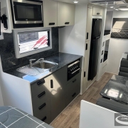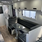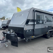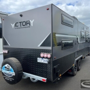 Victory Trophy Series Bunk Bed Caravan, 2 bunks with built in ladder, queen island bed with innerspring mattress & under bed storage, double glazed windows with built in blinds & flyscreens, full ensuite, top load washing machine, club lounge can convert to another bed, Thetford AES 3 way fridge/freezer, microwave, Gree air conditioning, gas/electric stove & grill, gas/electric hot water service, DO35 hitch, 6” chassis, tandem axle with shock absorbers, 245/75 tyres with 16” wheels, tunnel boot, battery pack & solar panel, roll out awning, chequer plate front & rear, stereo with internal & external speakers, picnic table, tare 2542kgs, 47306B