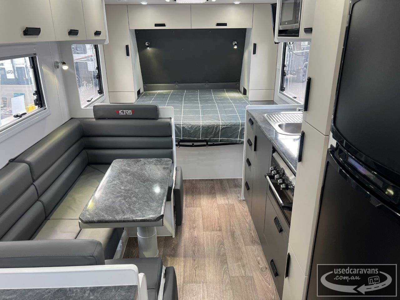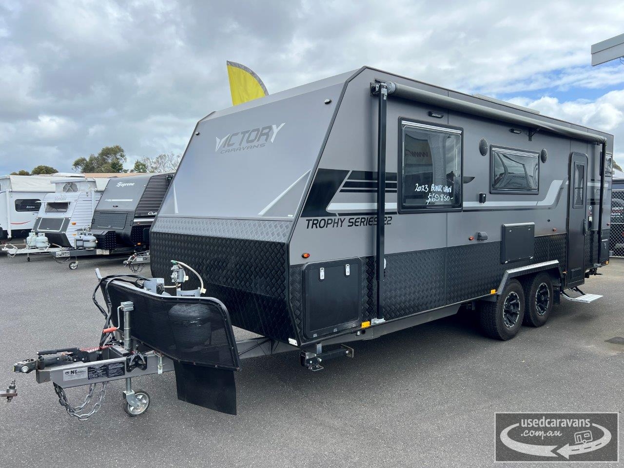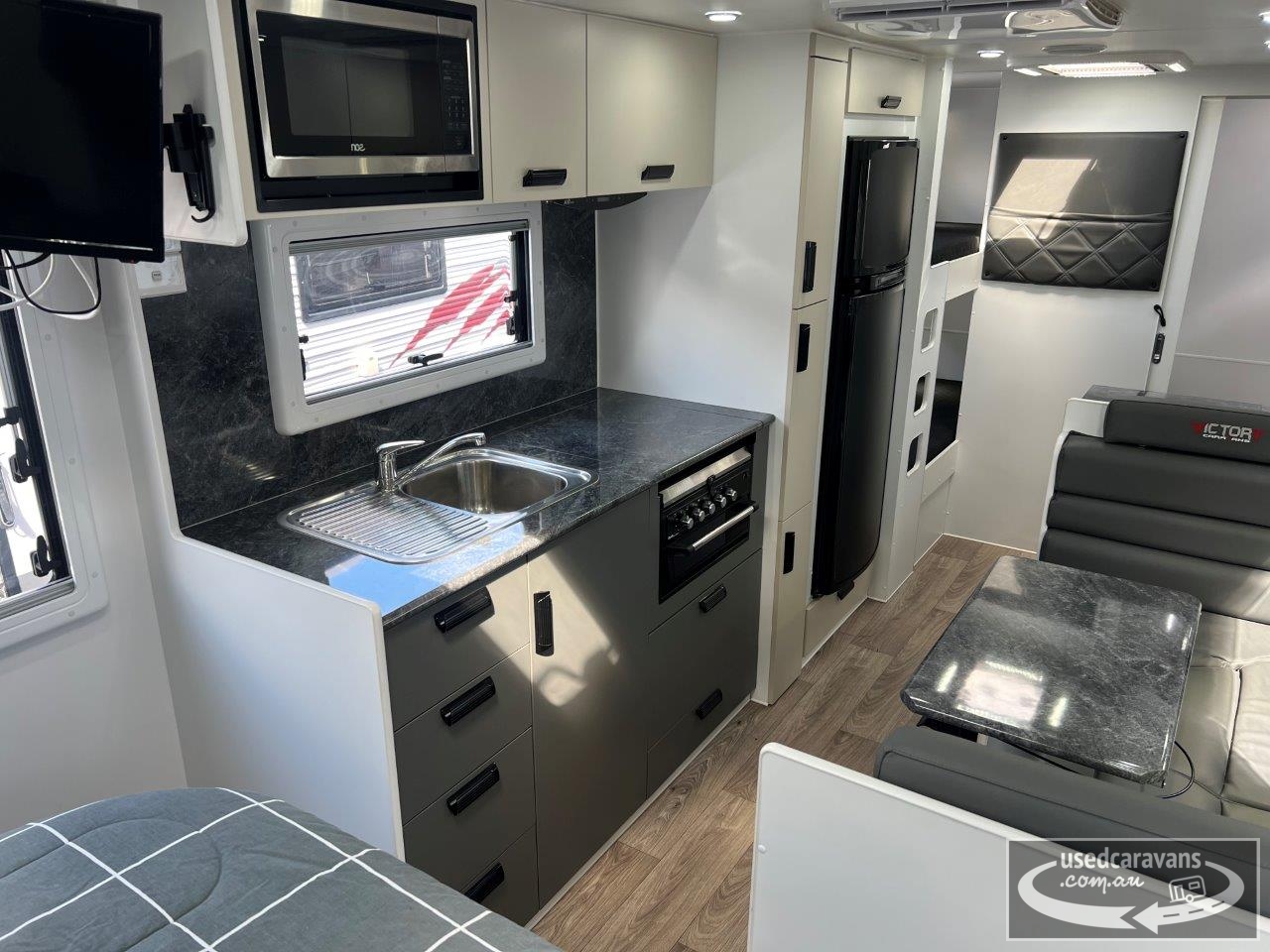 Victory Trophy Series Bunk Bed Caravan, 2 bunks with built in ladder, queen island bed with innerspring mattress & under bed storage, double glazed windows with built in blinds & flyscreens, full ensuite, top load washing machine, club lounge can convert to another bed, Thetford AES 3 way fridge/freezer, microwave, Gree air conditioning, gas/electric stove & grill, gas/electric hot water service, DO35 hitch, 6” chassis, tandem axle with shock absorbers, 245/75 tyres with 16” wheels, tunnel boot, battery pack & solar panel, roll out awning, chequer plate front & rear, stereo with internal & external speakers, picnic table, tare 2542kgs, 47306B