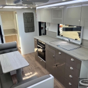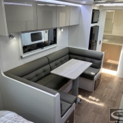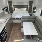 The tandem axle with leaf spring suspension ensures stable towing, while the composite panel exterior offers modern styling with superior insulation and durability. Tinted double-glazed windows with integrated blinds and flyscreens provide privacy, airflow, and temperature control in all conditions.