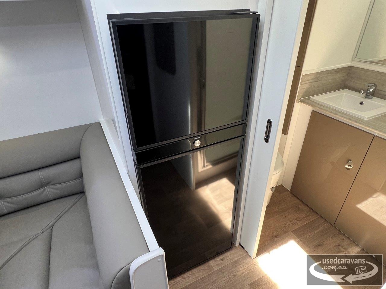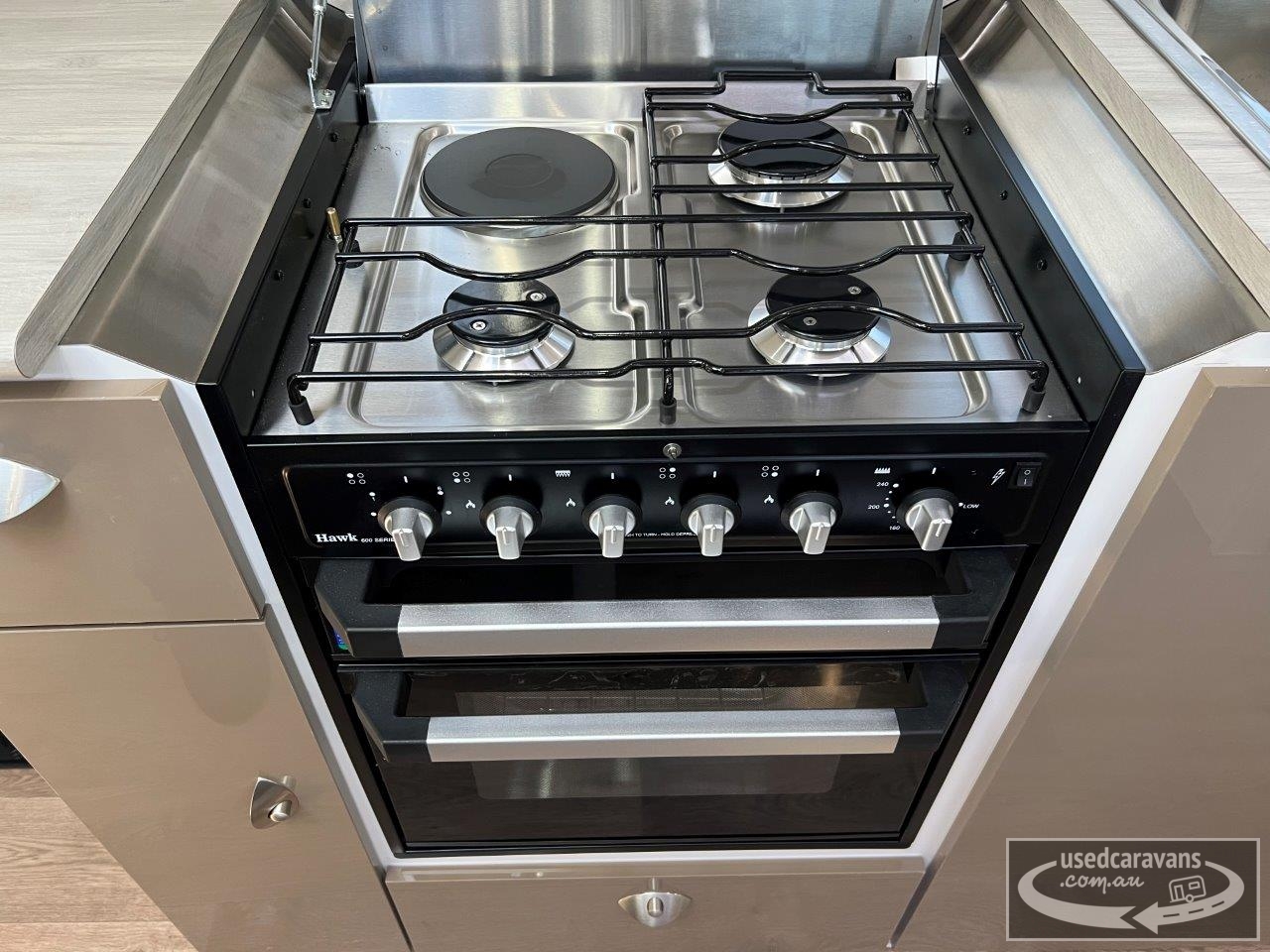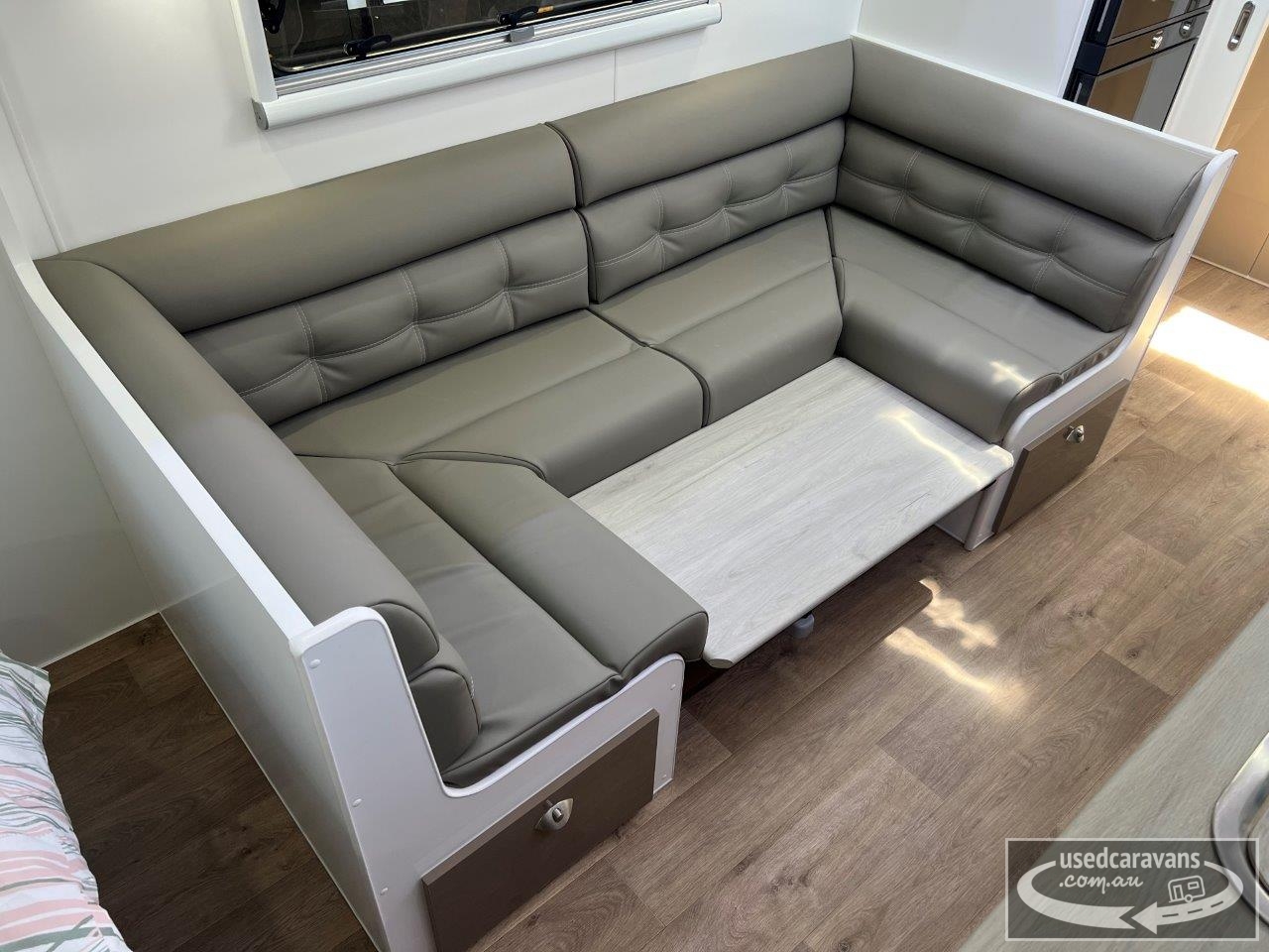The tandem axle with leaf spring suspension ensures stable towing, while the composite panel exterior offers modern styling with superior insulation and durability. Tinted double-glazed windows with integrated blinds and flyscreens provide privacy, airflow, and temperature control in all conditions.