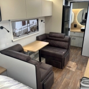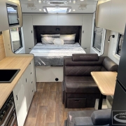 The Majestic Navigator features a riveted aluminium frame paired with composite panel walls inside and out, delivering a strong yet lightweight structure built to withstand the harshest environments. Its one-piece fibreglass roof provides added protection against the elements, ensuring a durable and watertight exterior. The caravan’s sleek and rugged design is built for longevity, with a focus on both practicality and aesthetics.